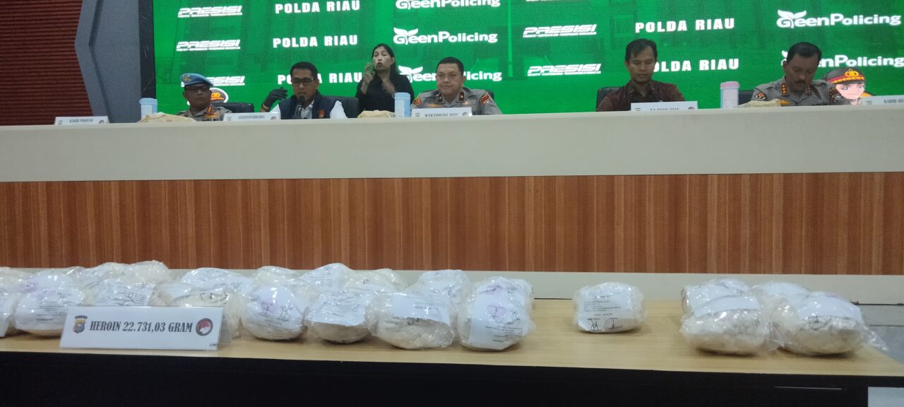 Pekanbaru, Dapurredaksi.com – Direktorat Reserse Narkoba Polda Riau berhasil mengungkap peredaran narkotika jenis heroin dalam jumlah besar di Kabupaten Bengkalis. Dalam operasi tersebut, polisi menyita sebanyak 42 bungkus heroin dengan berat kotor mencapai sekitar 23,32 kilogram dan mengamankan tiga orang tersangka.